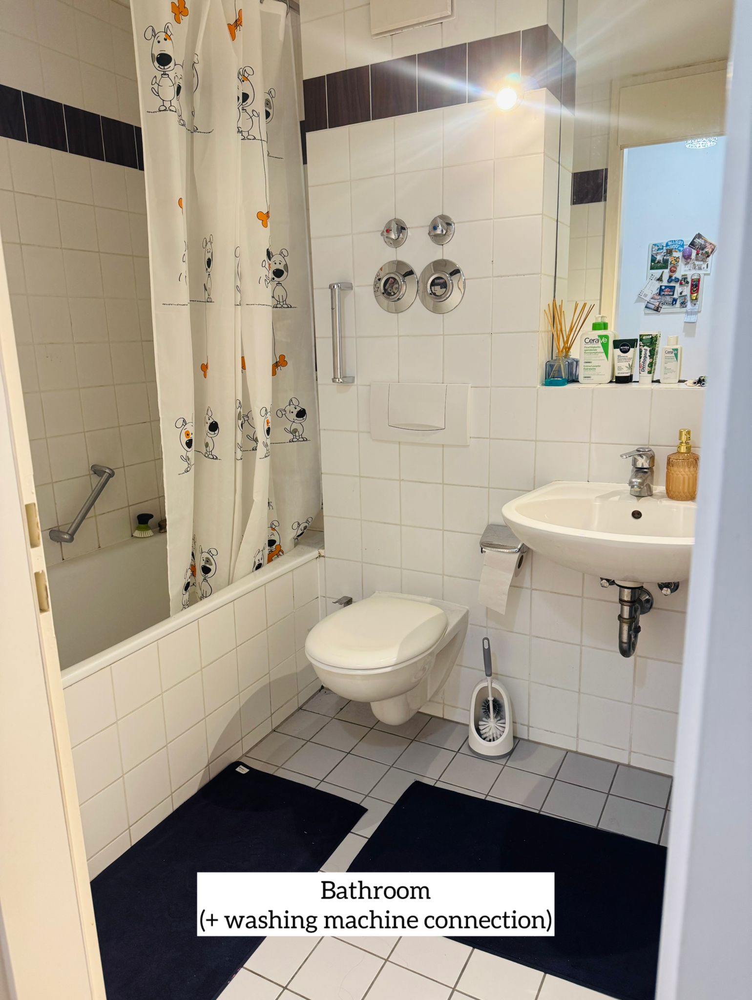 Das Badezimmer mit eigenem Waschmaschinen-Anschluss ist geschmackvoll ausgestattet, mit modernen Sanitäreinrichtungen und einem durchdachten Schnitt, der sowohl Komfort als auch Wohlfühlatmosphäre garantiert.