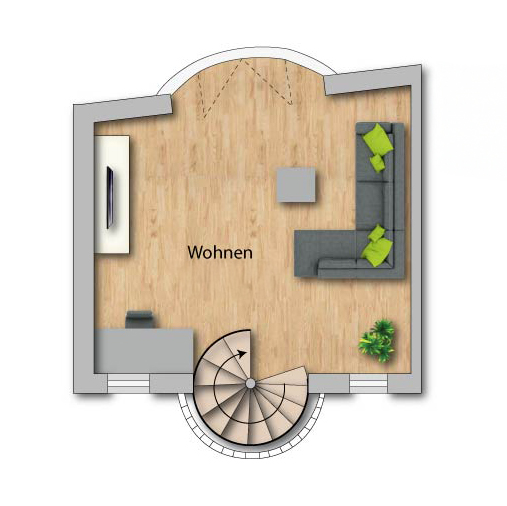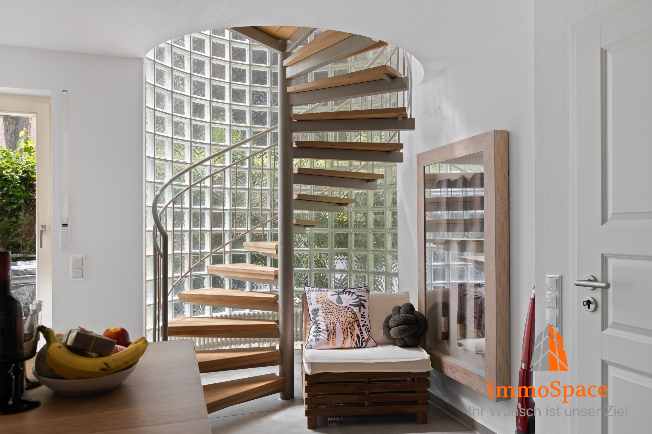 Über eine elegante Wendeltreppe gelangen Sie ins Obergeschoss, wo sich ein großzügiger Wohnbereich mit viel Tageslicht, stilvoller Möblierung und sogar einem XXL-Flachbildfernseher befindet. Dieser Raum ist ideal zum Entspannen, Arbeiten oder Gäste empfangen und bildet das wohnliche Zentrum des Hauses.
