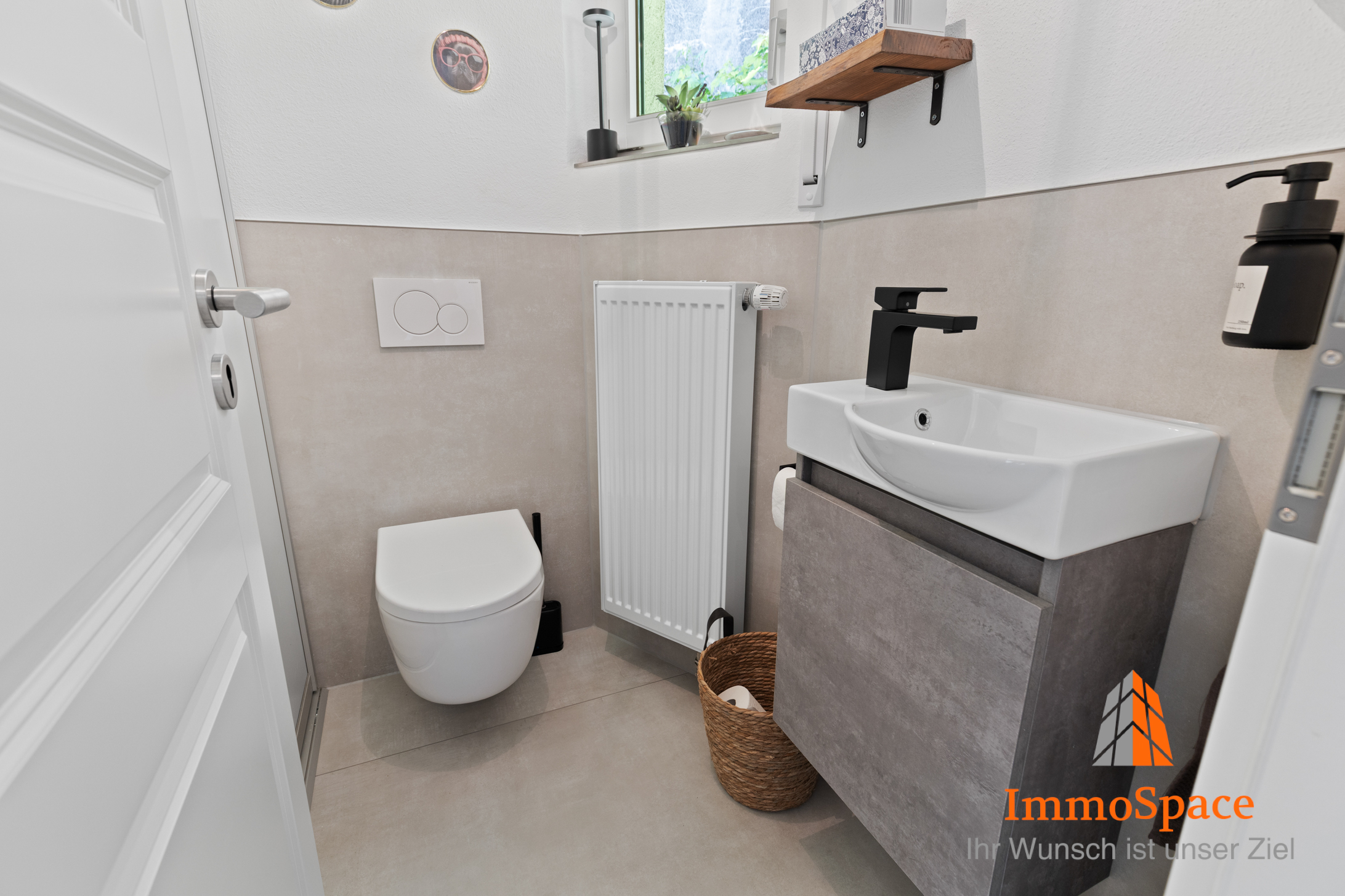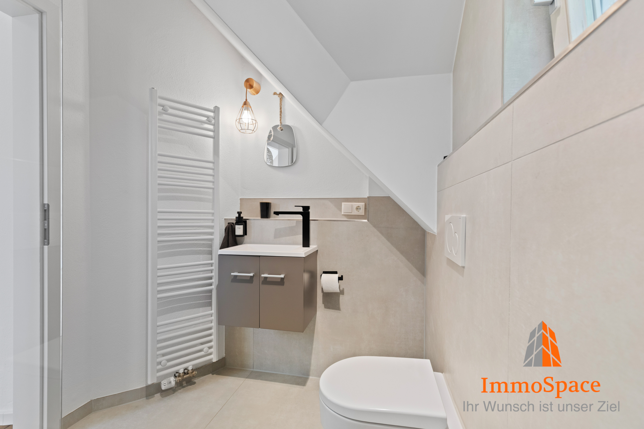 – Ebenerdige Dusche, neuwertiges Badezimmer mit XXL-Sandsteinfliesen, Fenster & Handtuchheizkörper