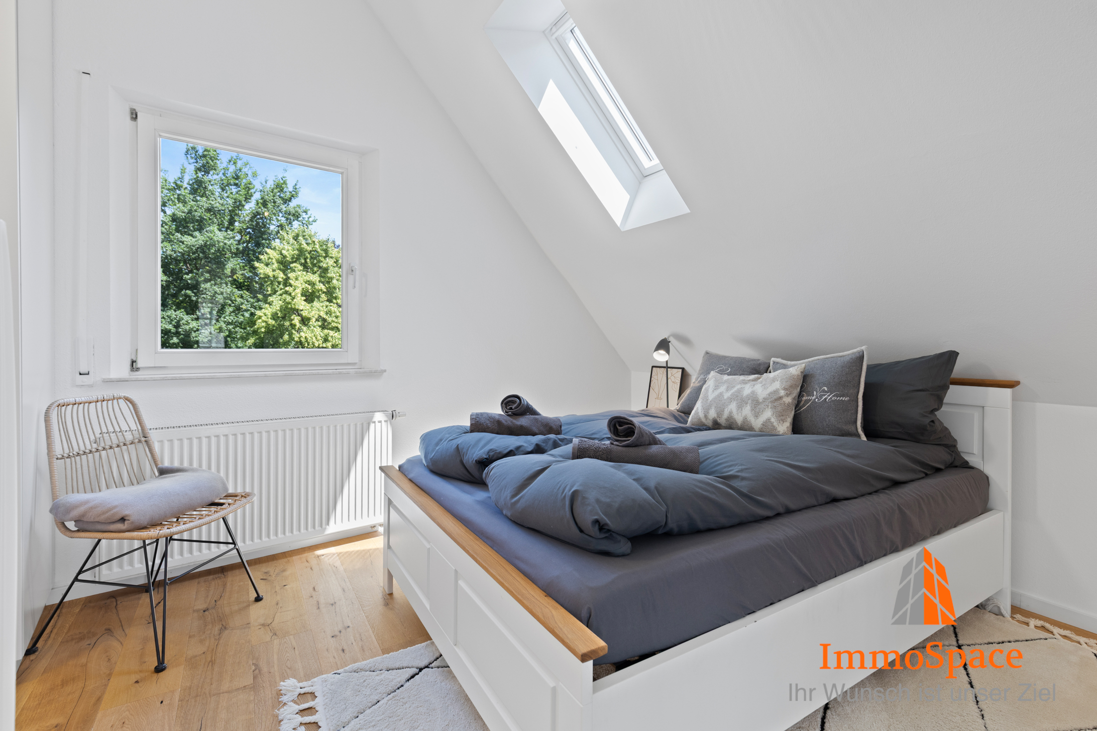 Im Dachgeschoss befindet sich der private Rückzugsbereich mit einem geschmackvoll eingerichteten Schlafzimmer und angrenzender Ankleide. Das moderne Tageslichtbad überzeugt mit einer ebenerdigen Regenkopfdusche, großformatigen Sandsteinfliesen, einem Handtuchheizkörper sowie einem Fenster – durchdachte Details, die Komfort und Design harmonisch verbinden.
