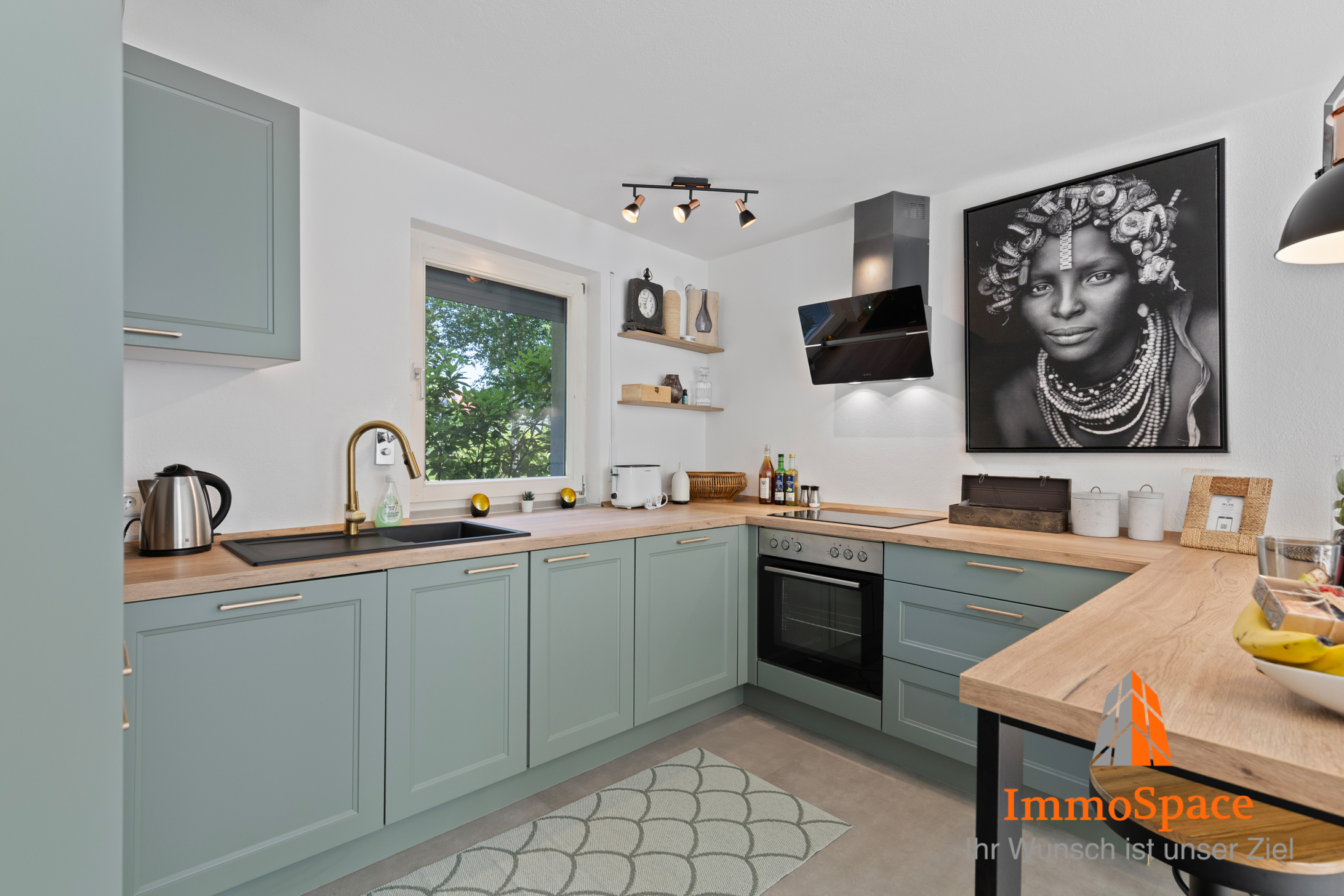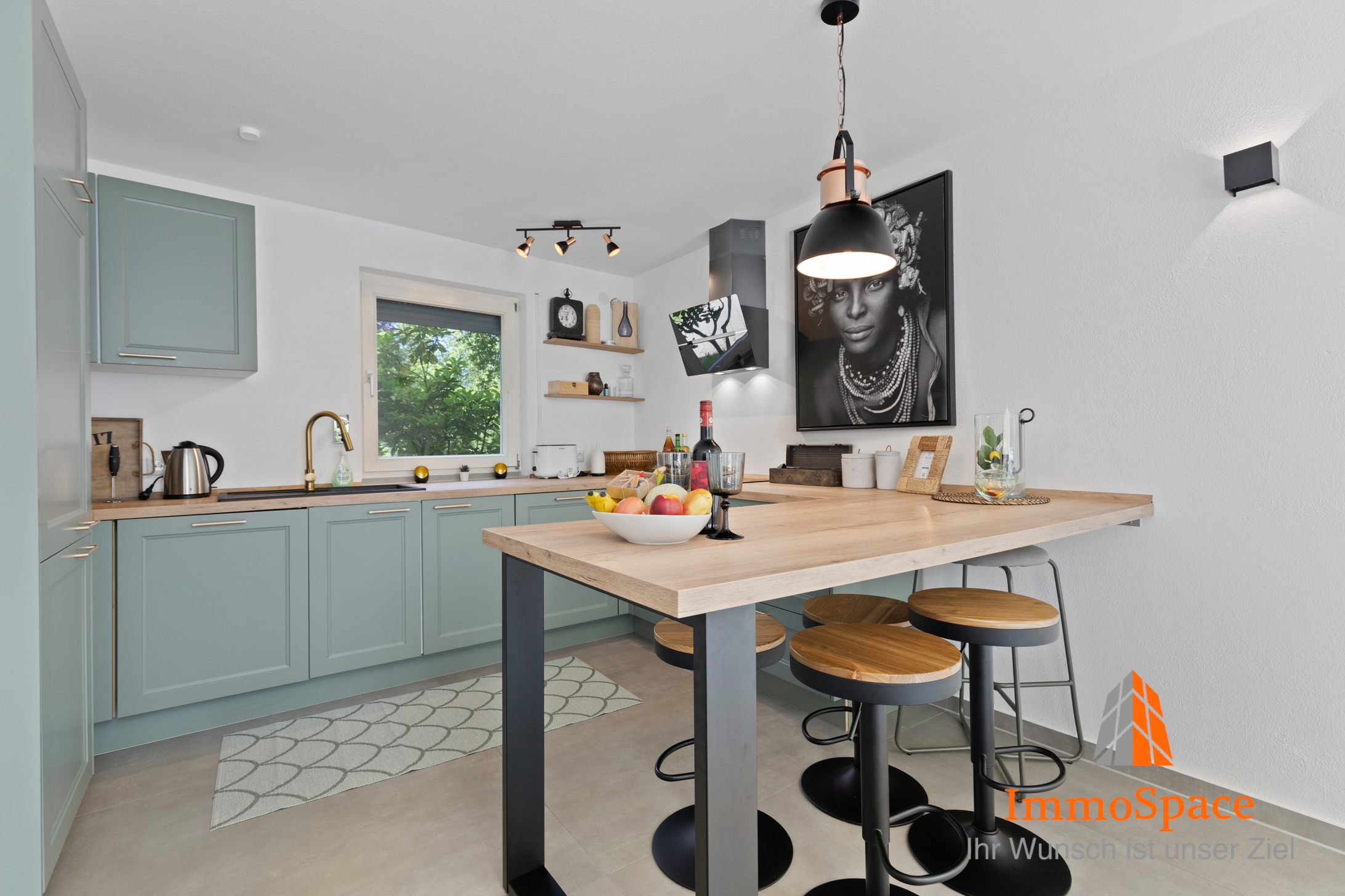 Bereits beim Betreten des Hauses empfängt Sie ein heller Eingangsbereich mit Gäste-WC und direktem Zugang zur offen gestalteten Wohnküche. Die moderne Einbauküche ist vollständig ausgestattet und geht fließend in den gemütlichen Essbereich über. Von hier aus gelangen Sie direkt auf die geschützte Terrasse – ein perfekter Ort für entspannte Stunden im Freien mit Blick ins Grüne. Direkt vor dem Haus lädt ein weitläufiger 3,4 ha großer Park mit Teichanlage und Flusslauf zu Spaziergängen oder sportlicher Betätigung ein.