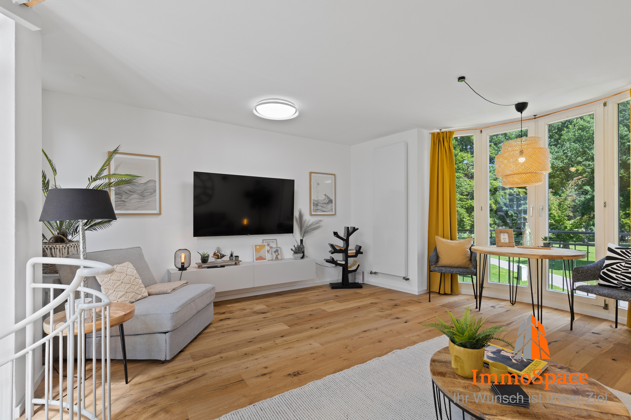 – Terrasse vorhanden und Park direkt vor der Haustür mit Teichanlage und Flusslauf