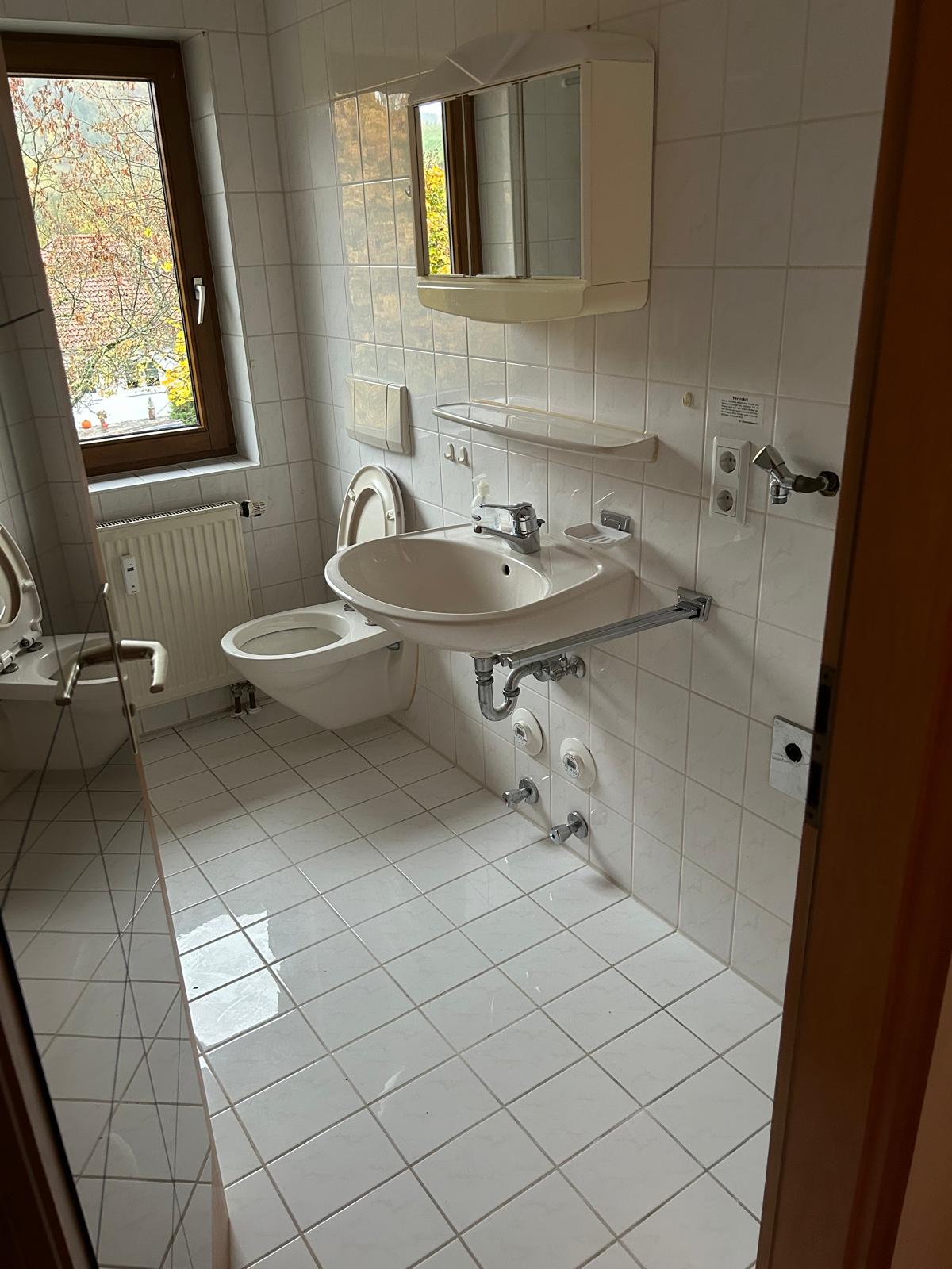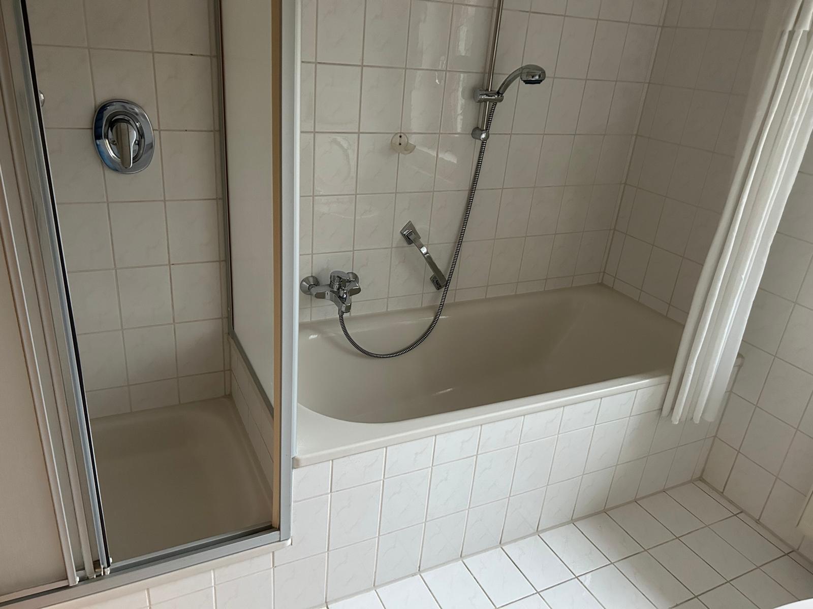 Das Badezimmer überzeugt durch klassische, weiße Fliesen und ist mit Badewanne, separater Dusche, Waschbecken, WC sowie einem praktischen Waschmaschinenanschluss ausgestattet. Ein Fenster sorgt für Tageslicht und eine angenehme Atmosphäre.