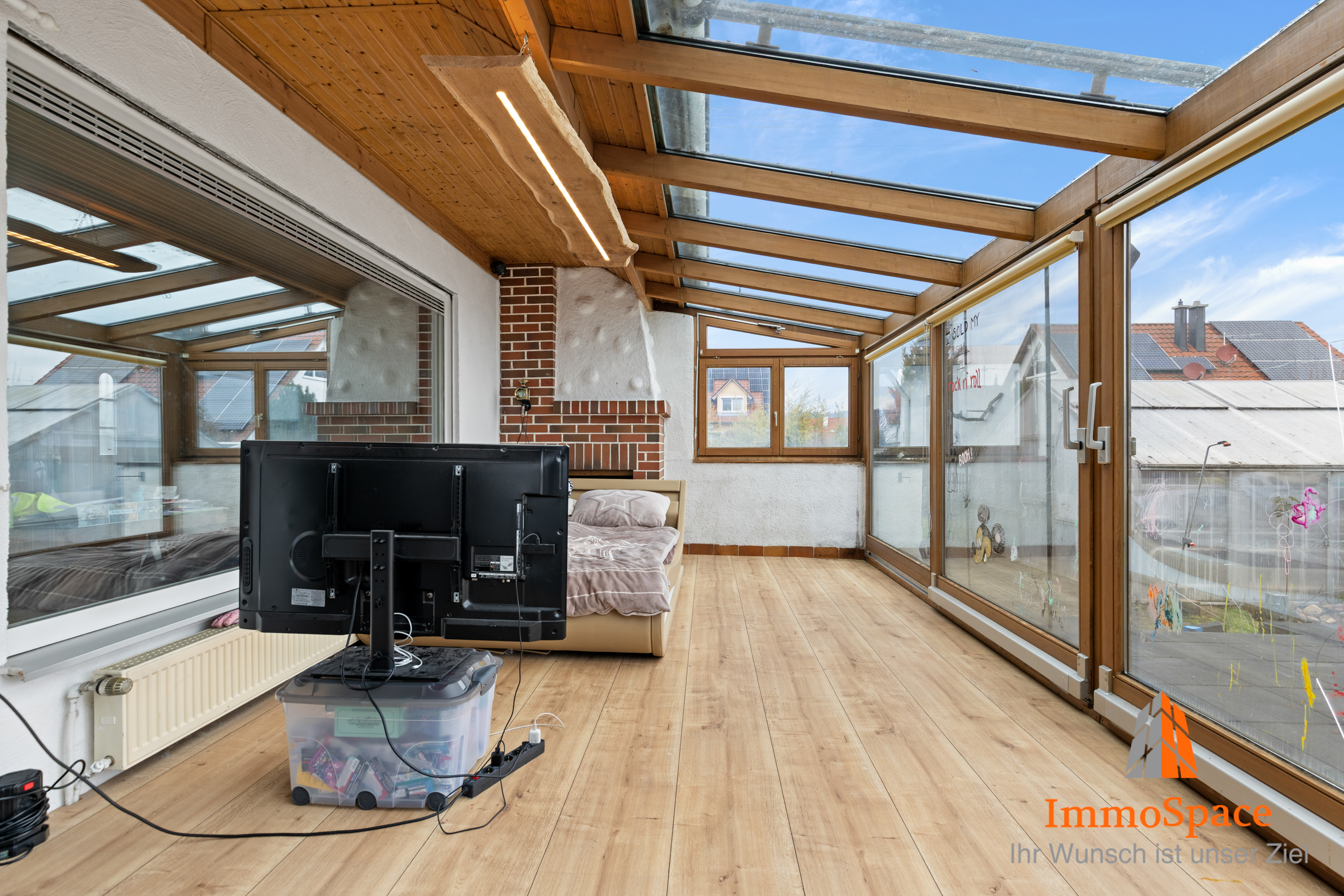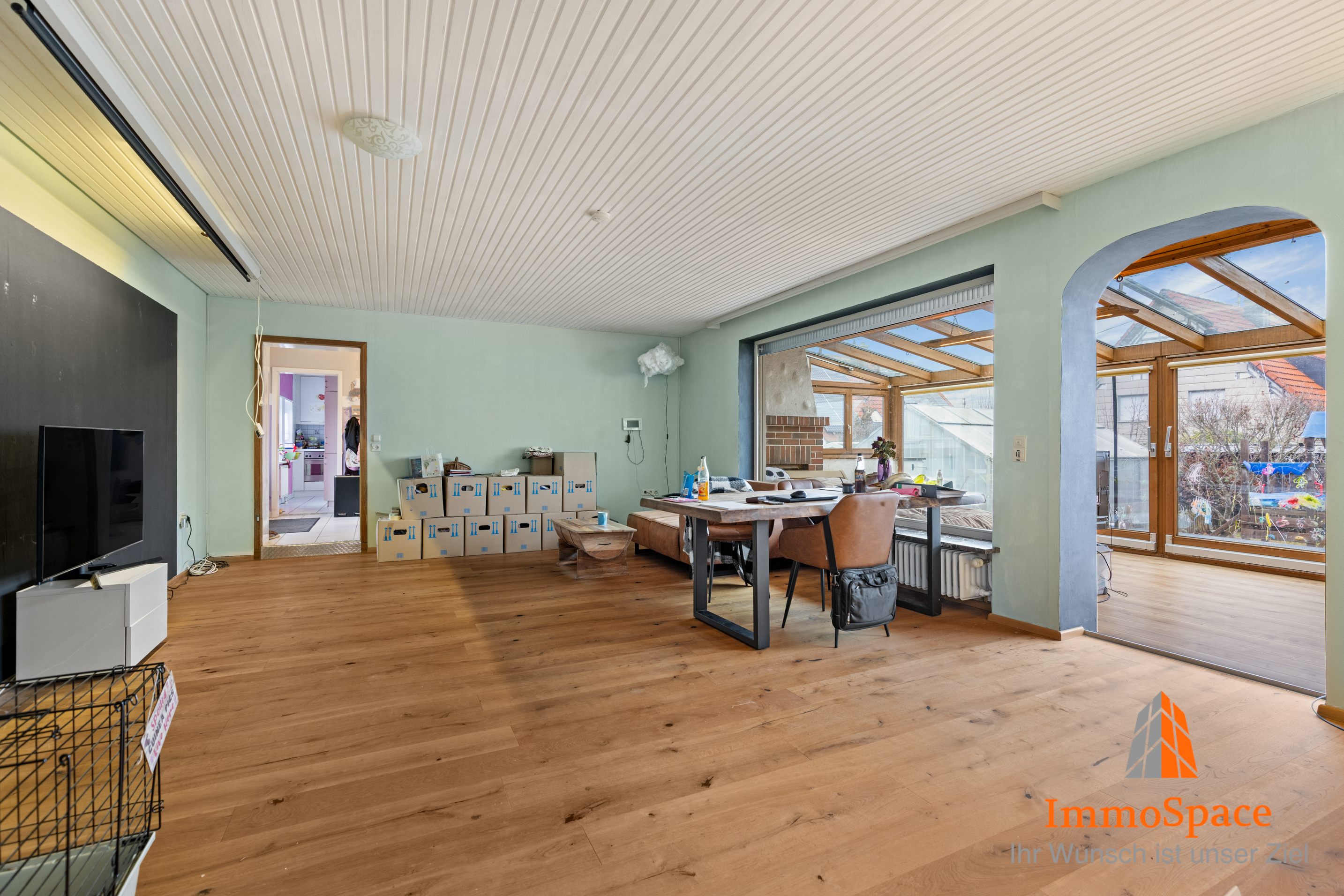 Ein besonderes Highlight ist der direkte Zugang in den XL-Wintergarten, der den Wohnbereich eindrucksvoll erweitert. Durch seine großzügige Glasfläche entsteht ein echtes Wohlfühlklima – perfekt als zweites Wohnzimmer, Essraum oder Ruhezone.