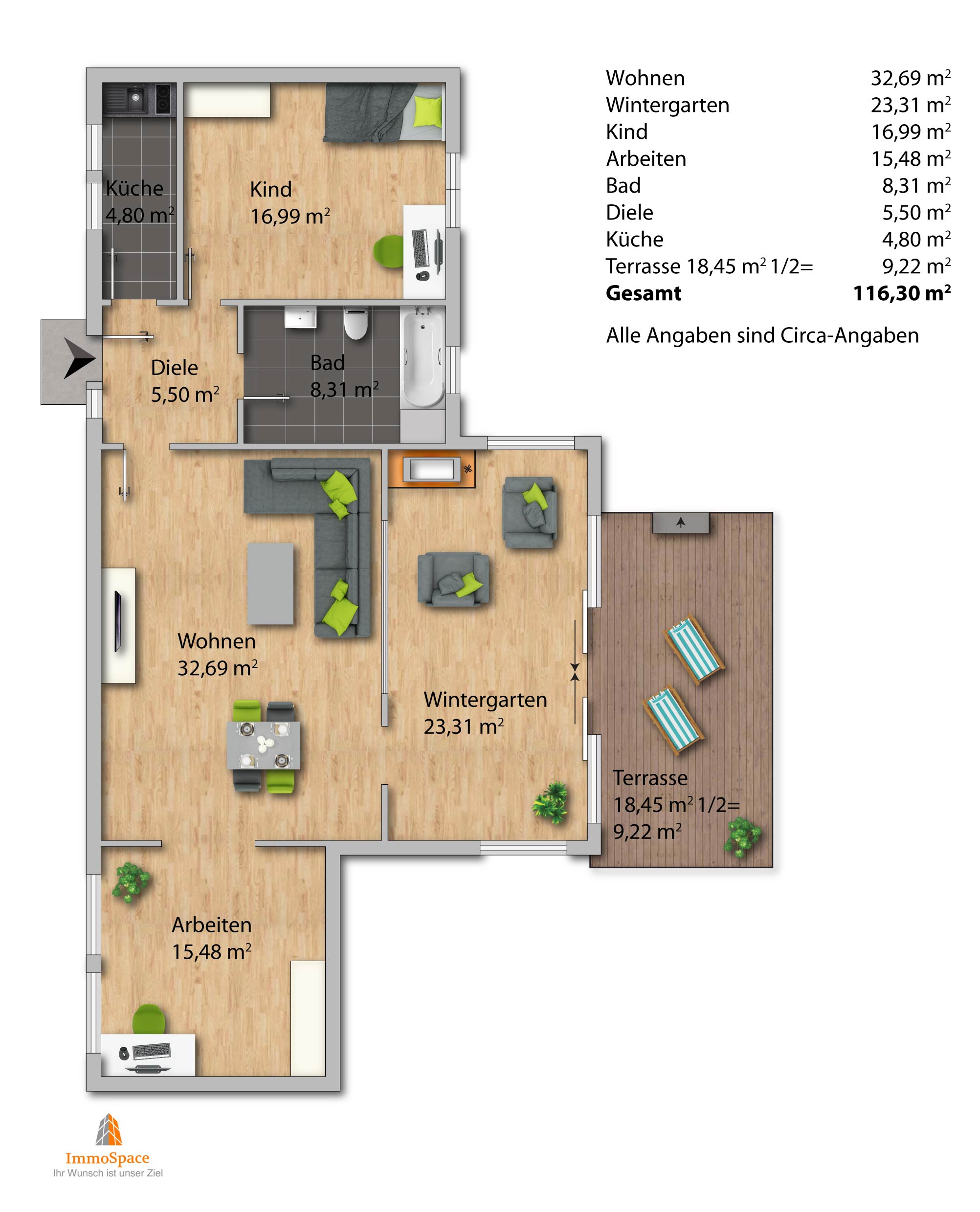 Alle Angaben nach bestem Wissen. Irrtum und Zwischenverkauf vorbehalten. Der Käufer zahlt im Erfolgsfall an die Firma ImmoSpace GmbH eine Käufer-Maklerprovision in Höhe von 2,50 % zzgl. der gesetzl. MwSt. Die Provision errechnet sich aus dem beurkundeten Kaufpreis. Dieses Exposé ist eine Vorinformation, als Rechtsgrundlage gilt allein der notariell abgeschlossene Kaufvertrag.