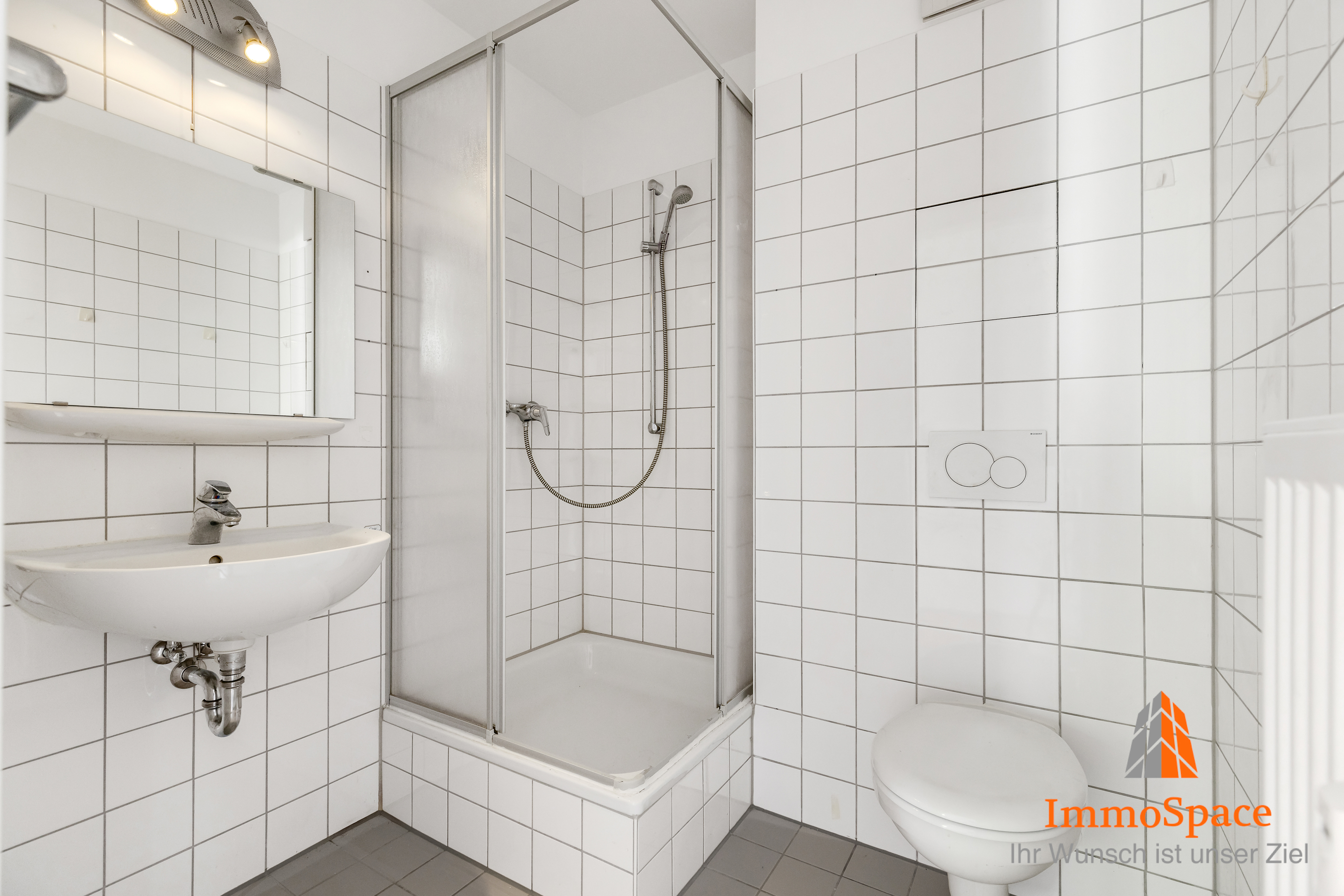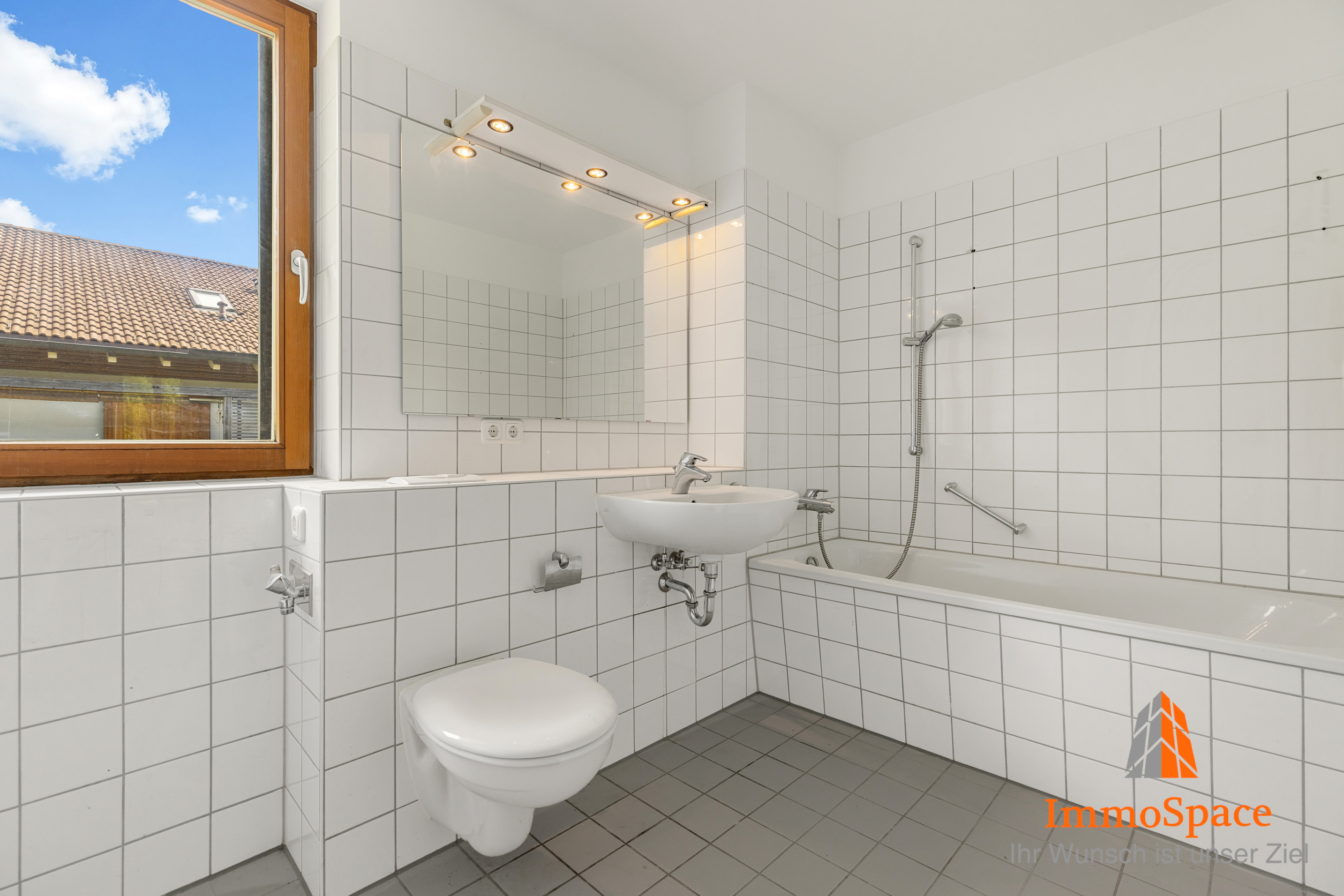 Das Tageslicht-Badezimmer verfügt über eine Badewanne, Waschbecken und Anschlussmöglichkeiten für Waschmaschine und Trockner. Ergänzt wird das Raumangebot durch ein separates Gäste-WC mit integrierter Dusche – ideal für Besucher oder als zusätzliche morgendliche Entlastung.
