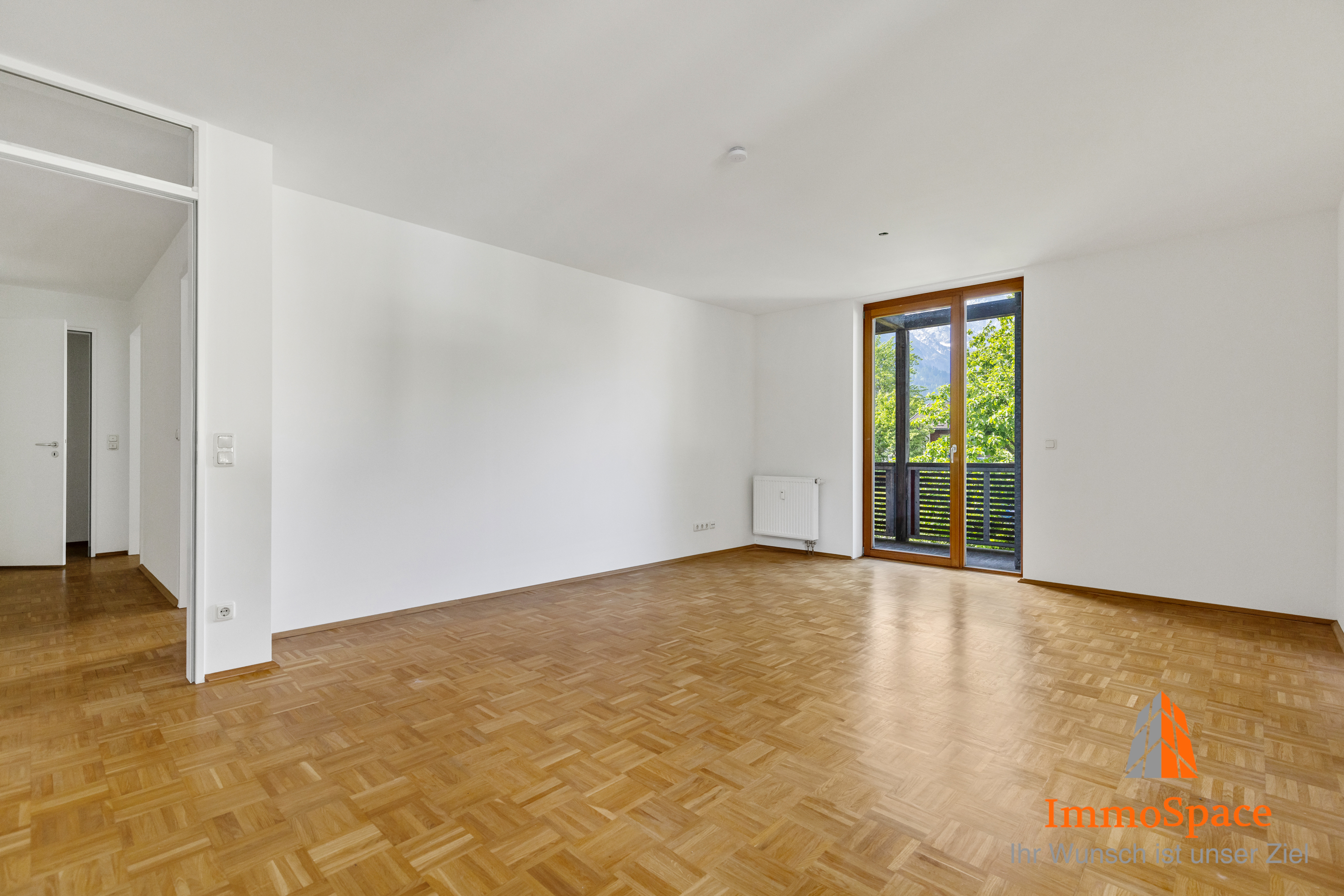 Von hier aus öffnet sich der Weg in das einladende Wohn- und Esszimmer, welches durch seine große Fensterfront besonders lichtdurchflutet ist. Der direkte Zugang zum Balkon bietet einen weiten Blick auf das beeindruckende Alpenpanorama – ein idealer Ort für entspannte Stunden im Freien.