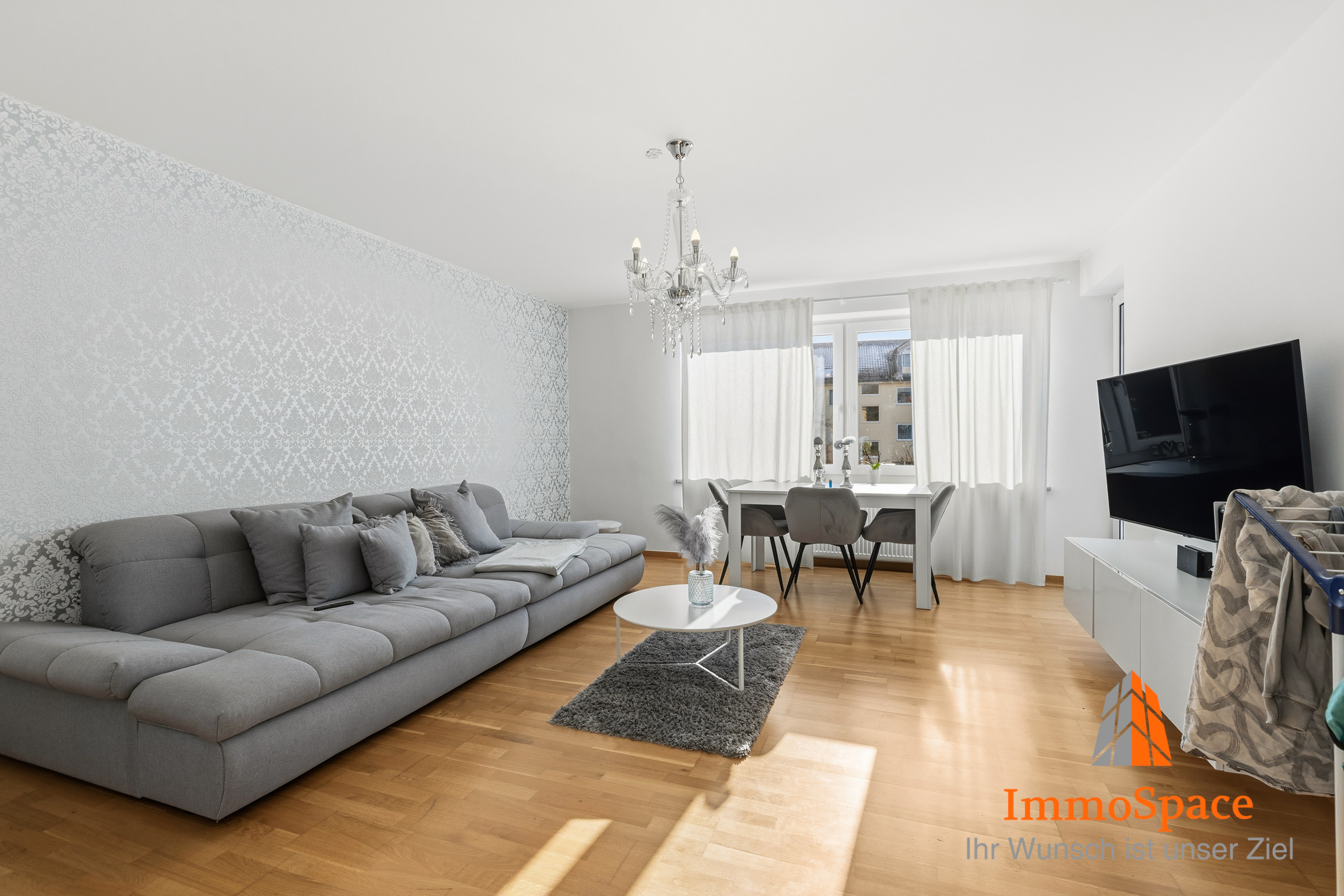 Das Wohnzimmer ist das Herzstück des Zuhauses: ein weitläufiger, lichtdurchfluteter Raum, der sowohl einen gemütlichen Lounge-Bereich als auch einen separaten Essplatz bietet. Die großen Fenster sorgen für eine freundliche Atmosphäre und schaffen ein angenehmes Wohngefühl.