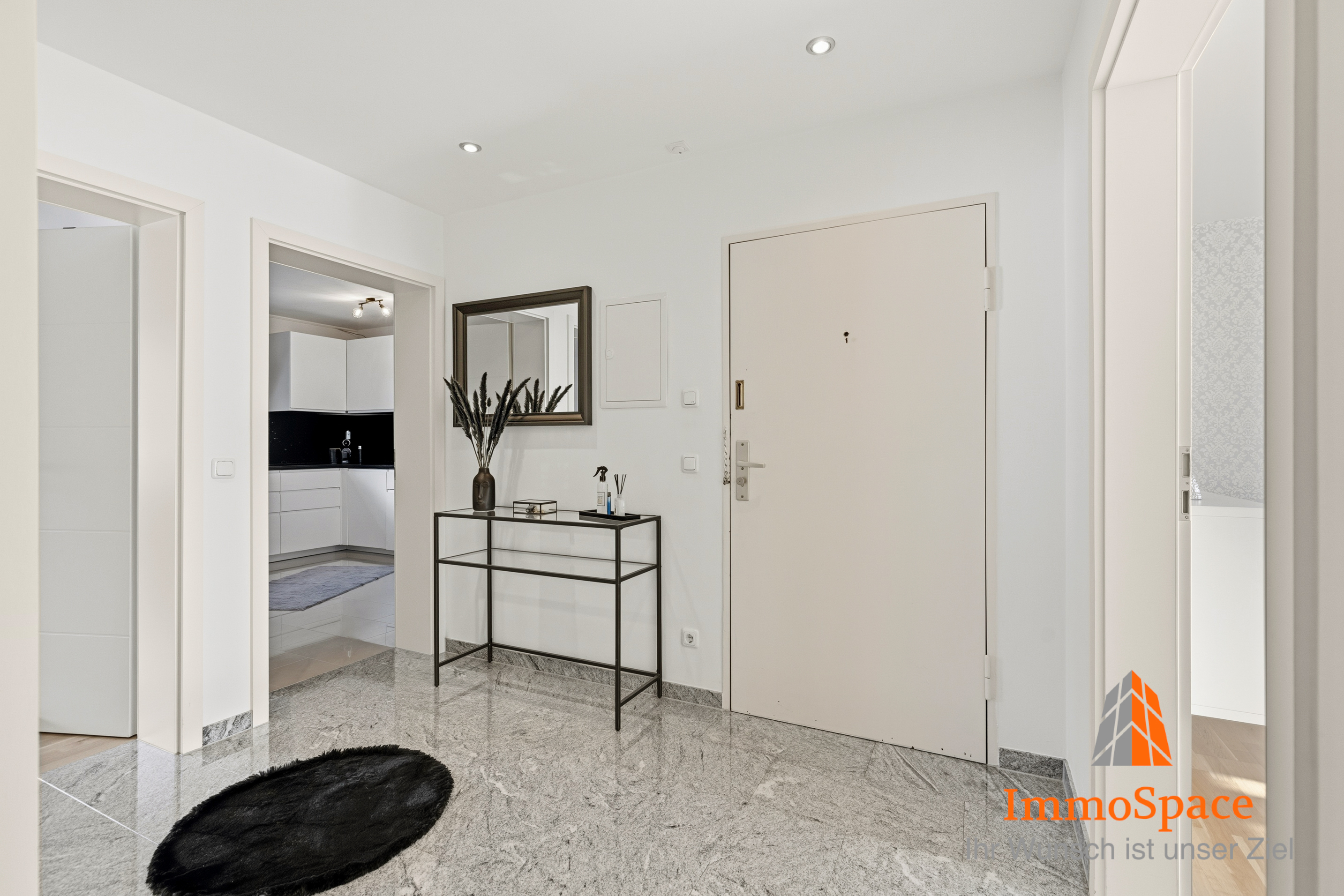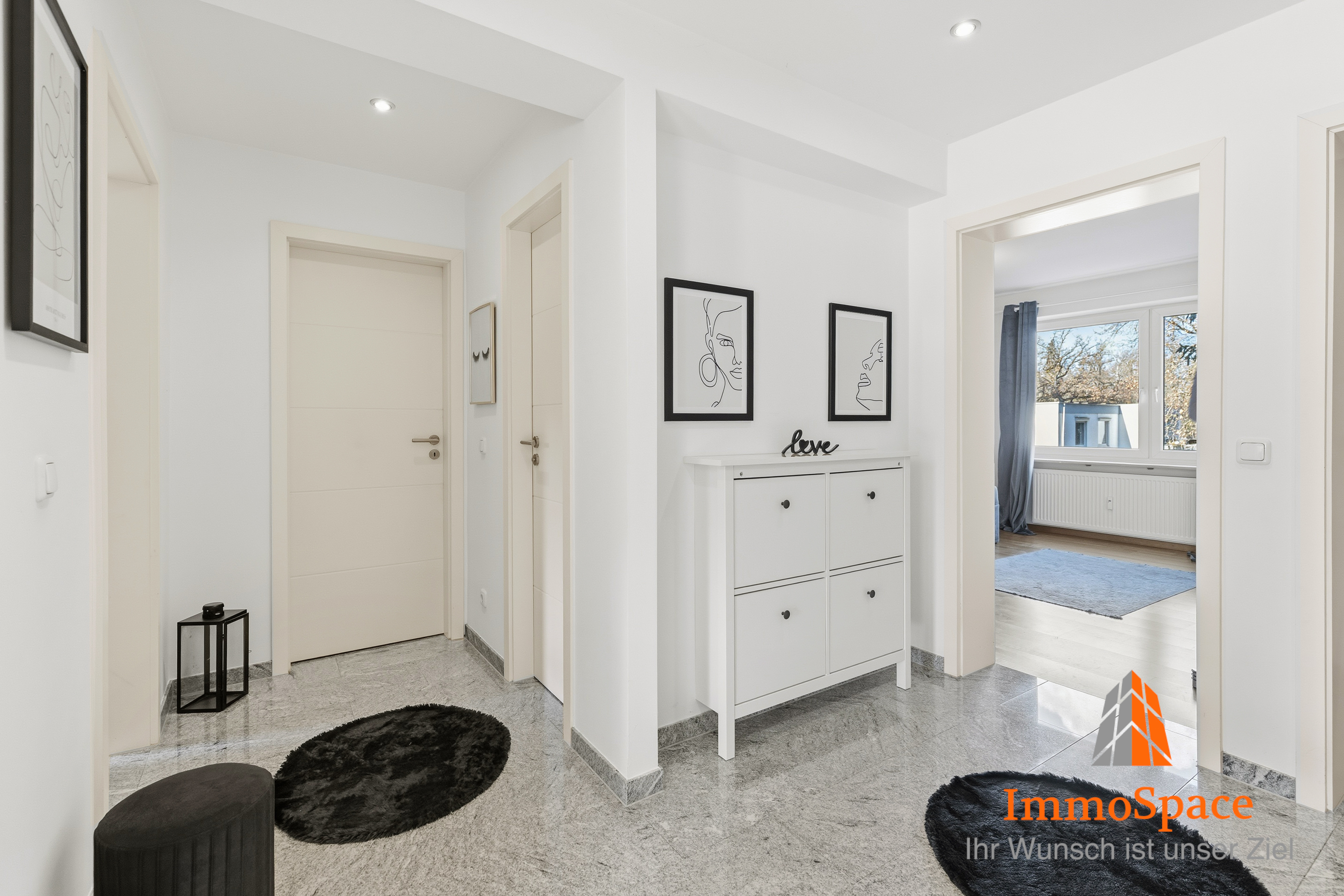 Gleich beim Betreten der Wohnung empfängt Sie ein zentral gelegener Flur, der ausreichend Platz für eine Garderobe bietet und einen harmonischen Übergang in alle Wohnbereiche schafft. Von hier aus erreichen Sie direkt den großzügigen Wohnbereich sowie die weiteren Zimmer der Wohnung.