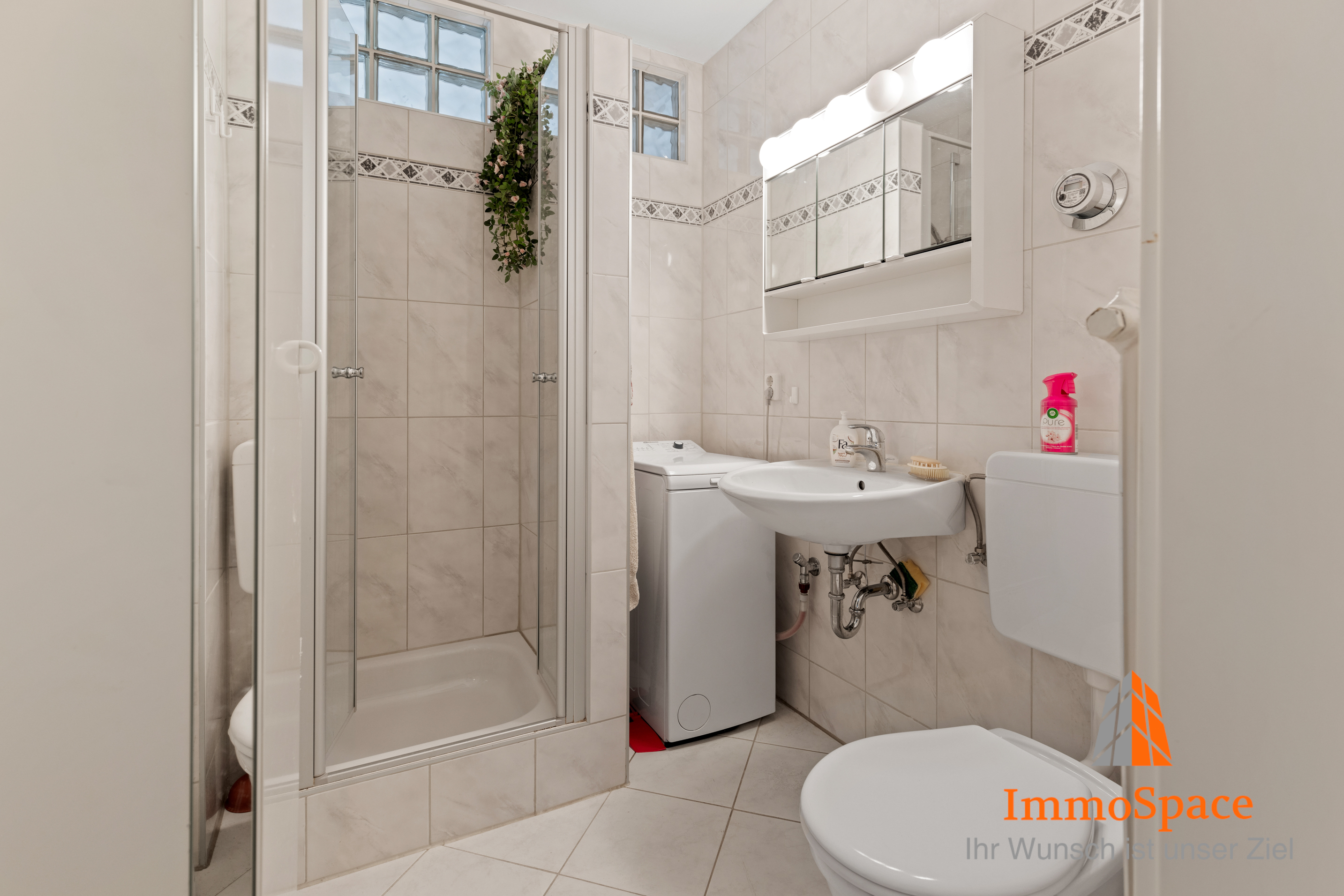 Das Badezimmer verfügt über Tageslicht und eine Dusche sowie eine separate Nische für die Top-Lader-Waschmaschine. Hell und einladend bietet es einen angenehmen Rückzugsort für den perfekten Start in den Tag oder das entspannte Abendritual.