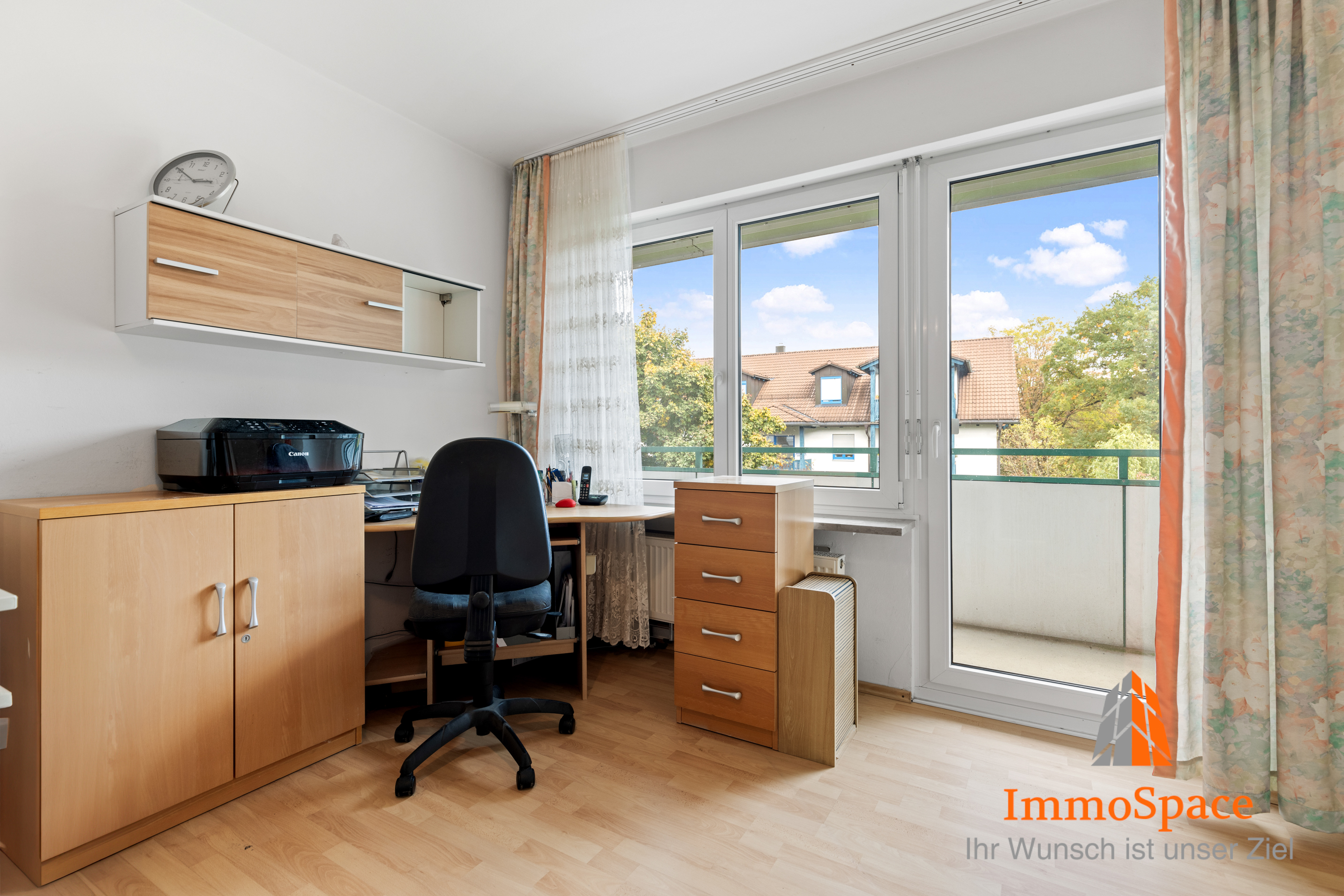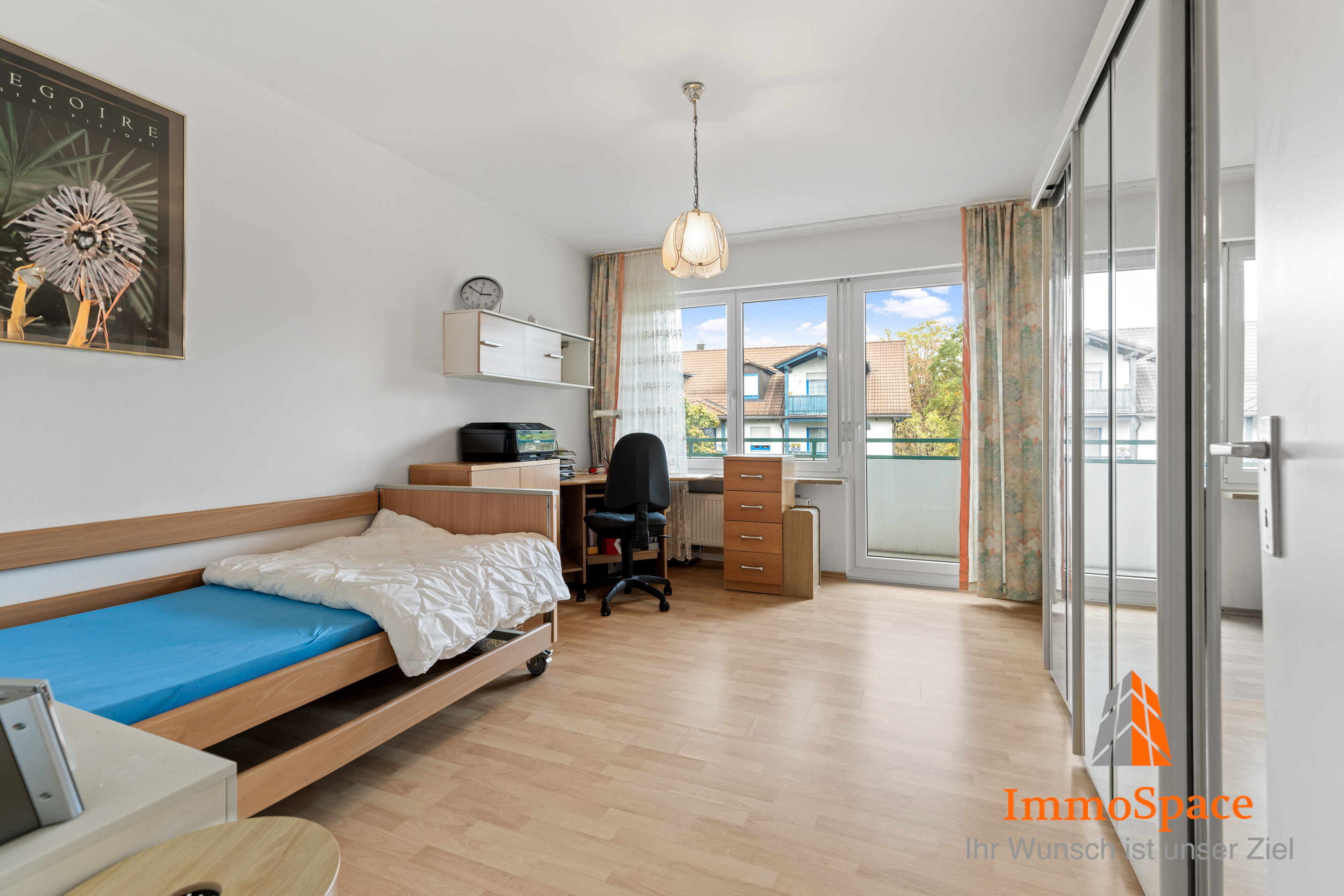 Das Schlafzimmer ist geräumig und bietet neben Platz für ein gemütliches Bett die Möglichkeit, einen Bereich für ein Homeoffice einzurichten – perfekt für modernes Arbeiten von zuhause.