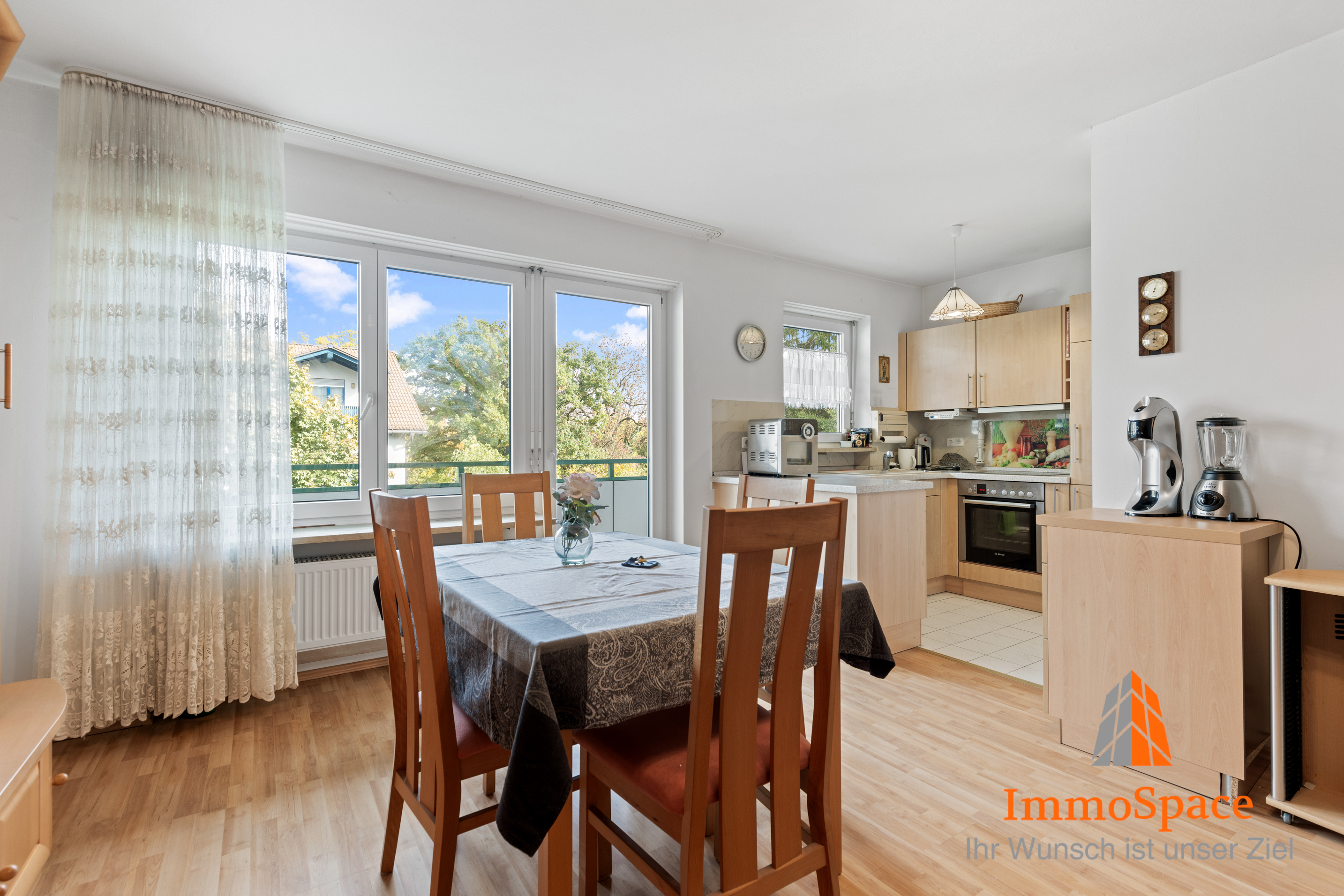 Der Wohn- und Essbereich ist offen, hell und großzügig geschnitten – ein idealer Ort zum Entspannen, Kochen und Zusammensein. Große Fenster durchfluten den Raum mit Tageslicht und schaffen eine freundliche, einladende Atmosphäre.