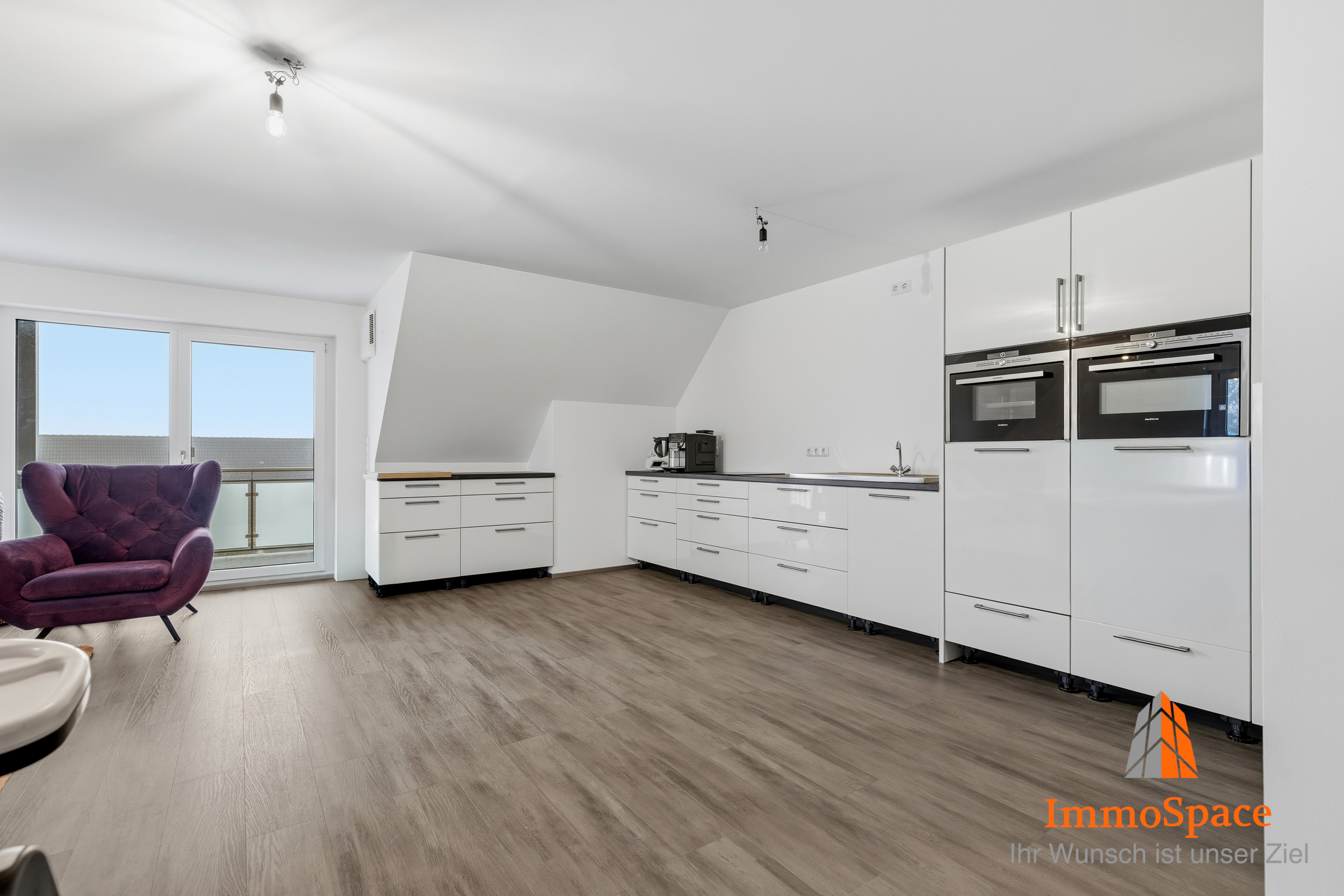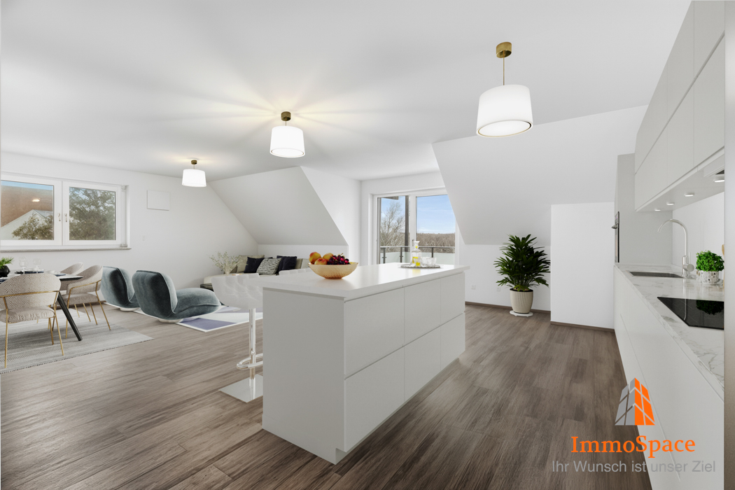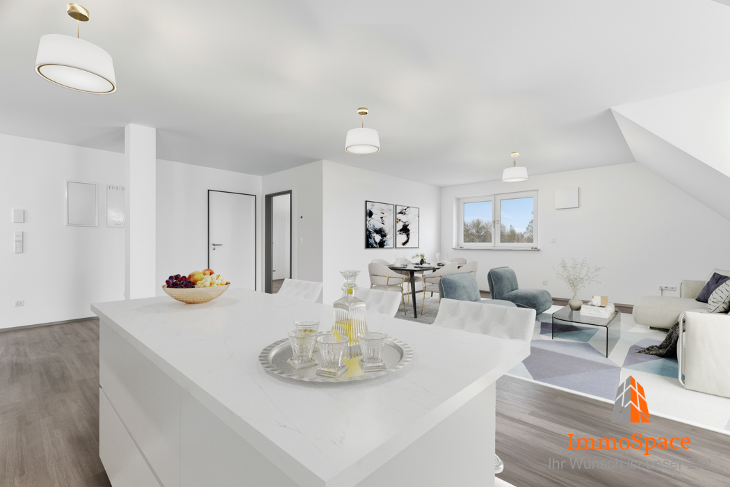 Das Herzstück der Wohnung bildet der offen gestaltete Wohn- und Essbereich mit moderner Küchenzeile. Das offene Raumkonzept bietet viel Platz zum Kochen, Essen und Entspannen.