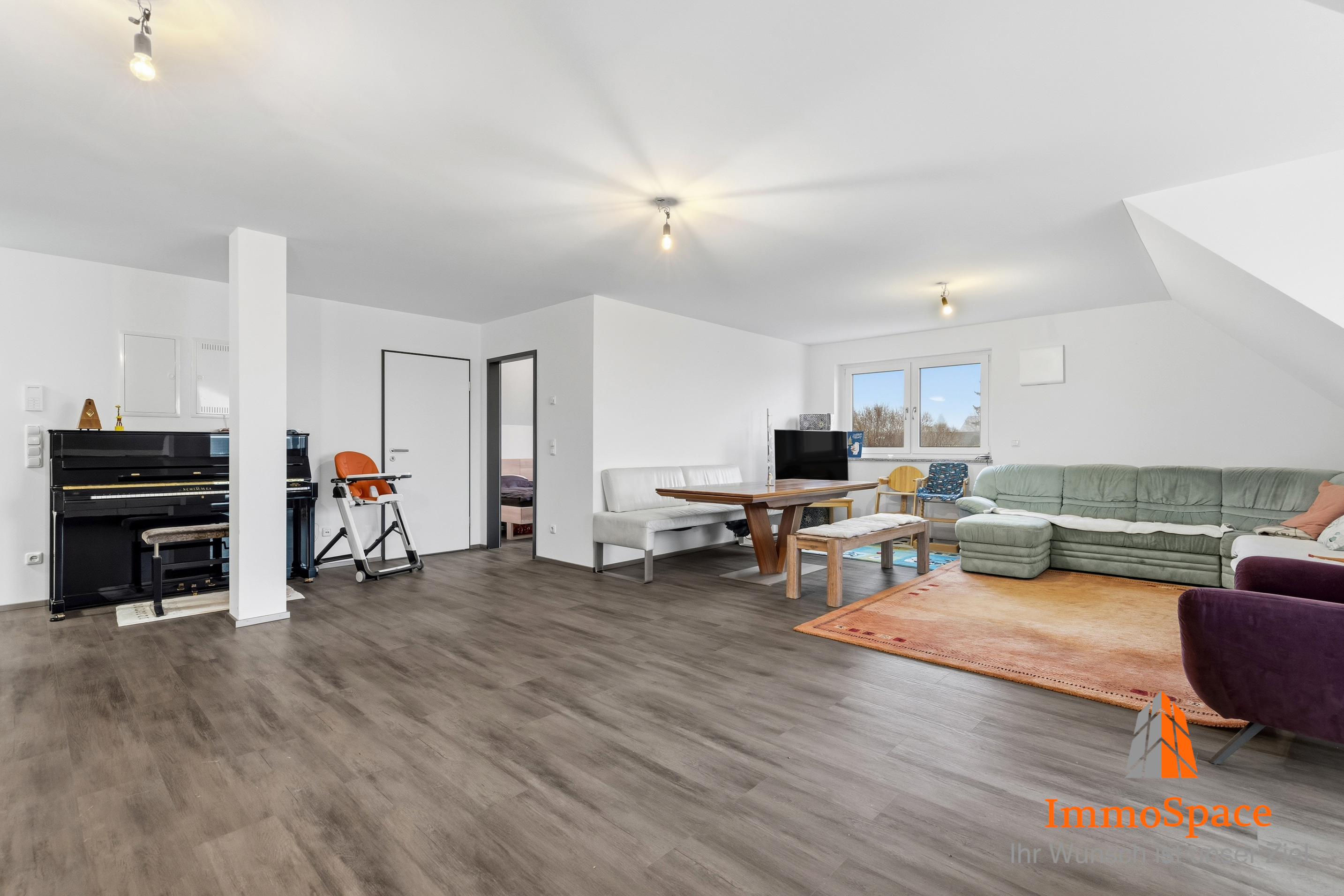 Eine große, zweiflügelige Balkontüre sorgt für eine besonders helle Atmosphäre und durchflutet den Raum mit viel Tageslicht. In Kombination mit den 3-fach verglasten Fensterflächen, dem hochwertigen Vinylboden sowie den elektrischen Rollläden ergibt sich ein stimmiges und modernes Wohnbild.