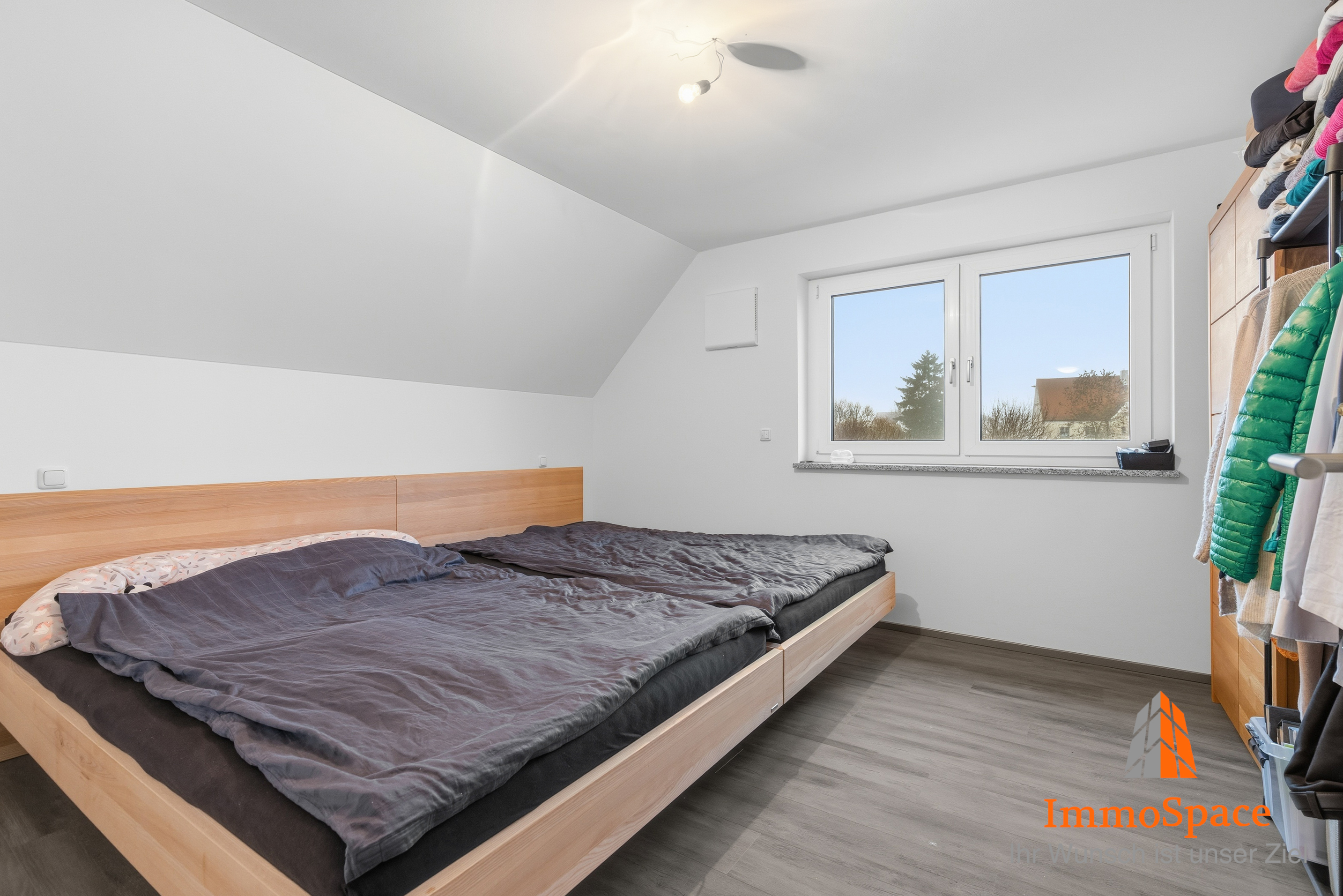 Das Schlafzimmer überzeugt durch ein großes Doppelfenster, das den Raum freundlich und hell wirken lässt. Dank der guten Raumaufteilung findet hier zudem problemlos ein großer Kleiderschrank seinen Platz.