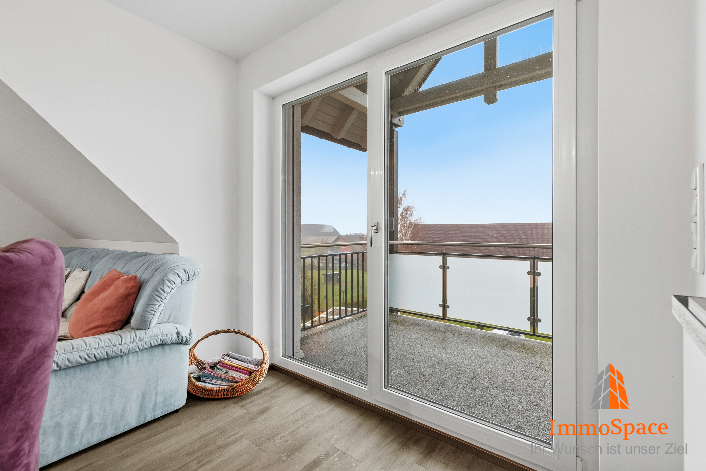 Vom Wohnbereich gelangen Sie direkt auf den sonnigen Balkon, welcher den Wohnraum sinnvoll erweitert und zum Verweilen im Freien einlädt – ideal für entspannte Stunden oder den Start in den Tag. (mit Weitblick ins Grüne)