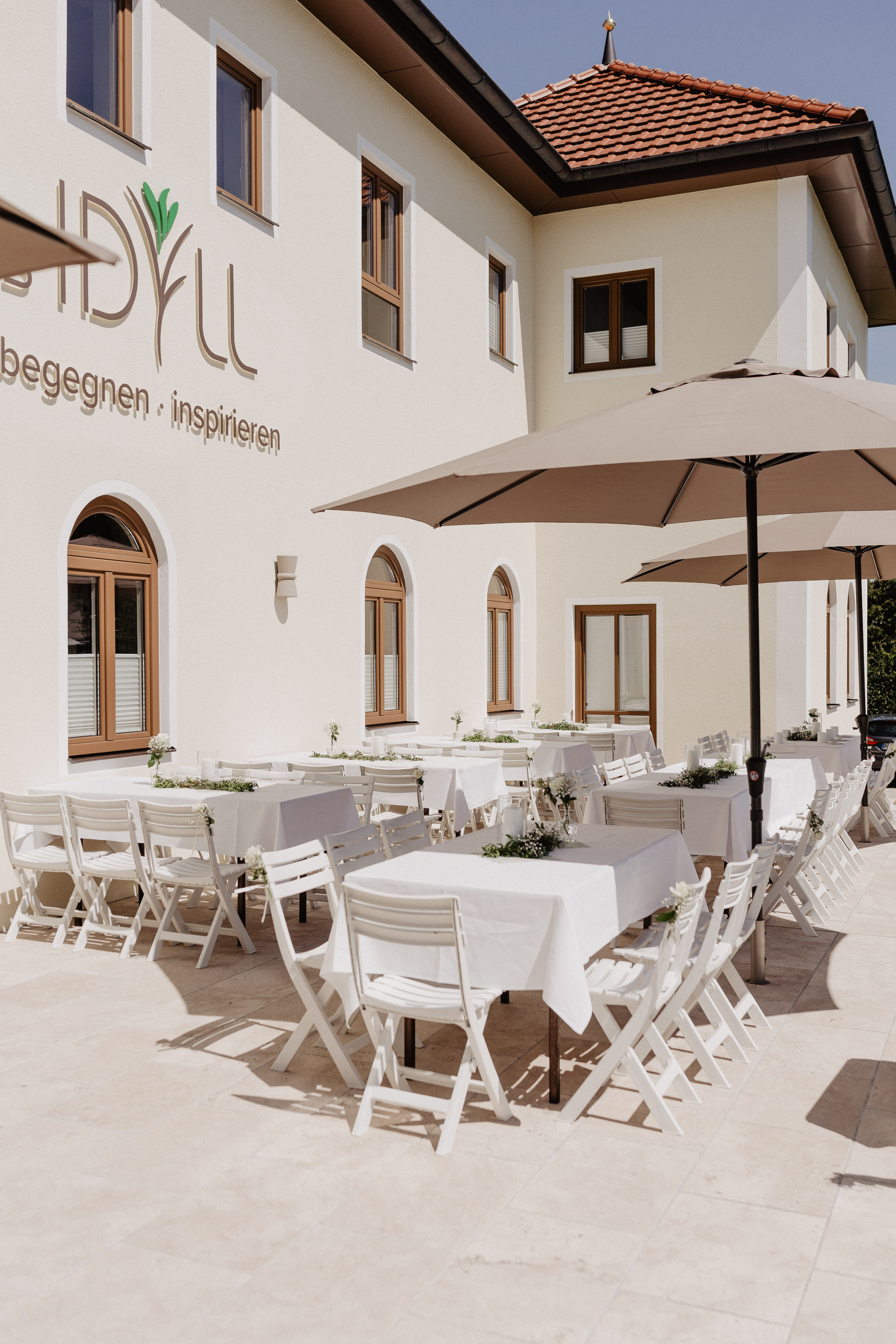 Im Jahr 2013 neu errichtet, bietet „Das Idyll“ ein modernes Veranstaltungskonzept mit professioneller Ausstattung. Auf ca. 480 m² Nutzfläche verteilen sich ein großzügiger moderner Gastraum, eine hochwertig ausgestattete Gastronomieküche, separate Kühlräume, Lager, moderne Sanitäranlagen sowie ein Obergeschoss mit Büro, Bad und großem, ausbaufähigem Saal. Eine große, sonnige Terrasse (78 m²) und ein separater Anlieferungsbereich runden das Konzept ab. Ideal für Hochzeiten, Seminare und Firmenevents.