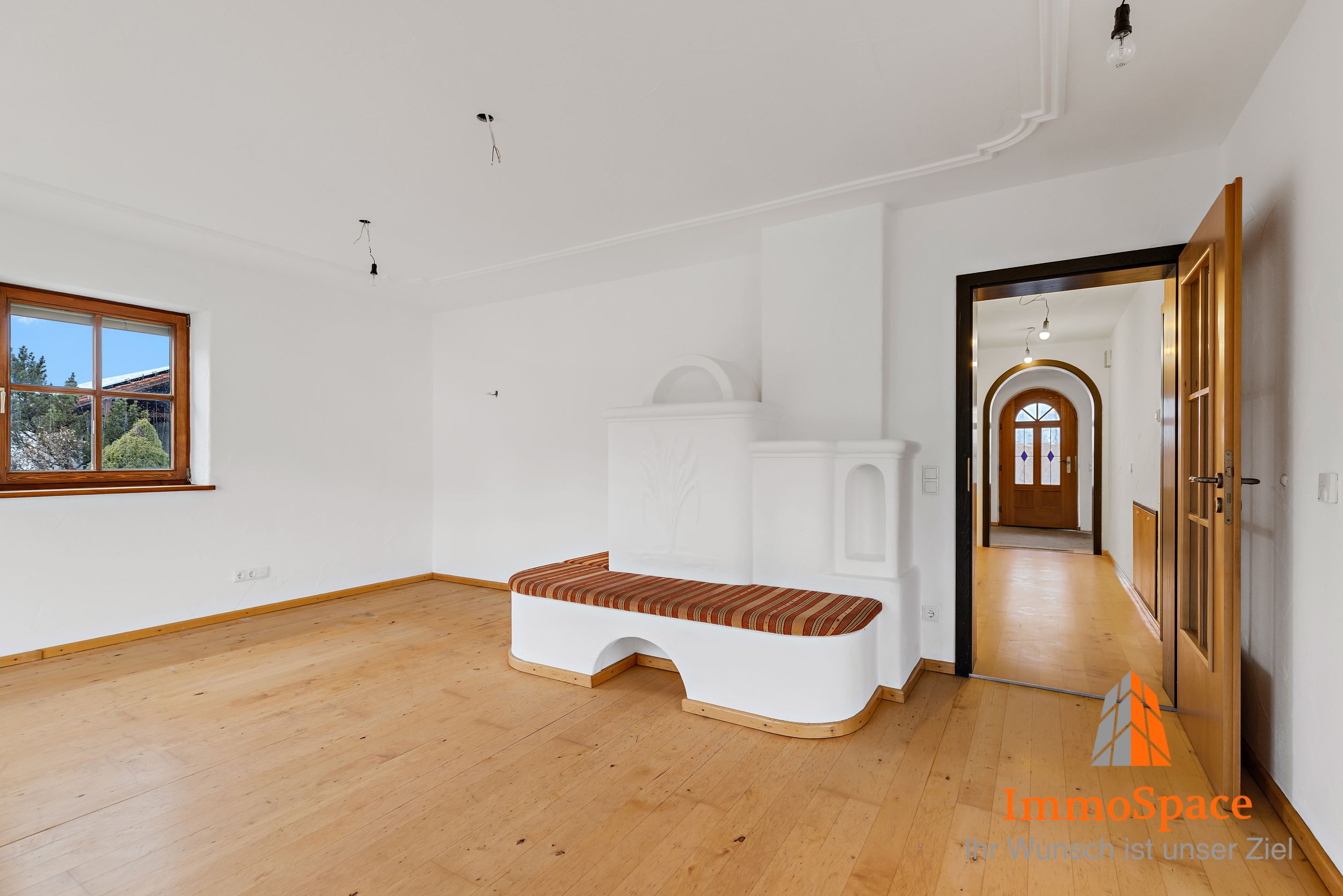 Der derzeitige Kachelofen muss nachgerüstet werden – hier besteht jedoch auch noch eine weitere Anschlussmöglichkeit im Flurbereich.