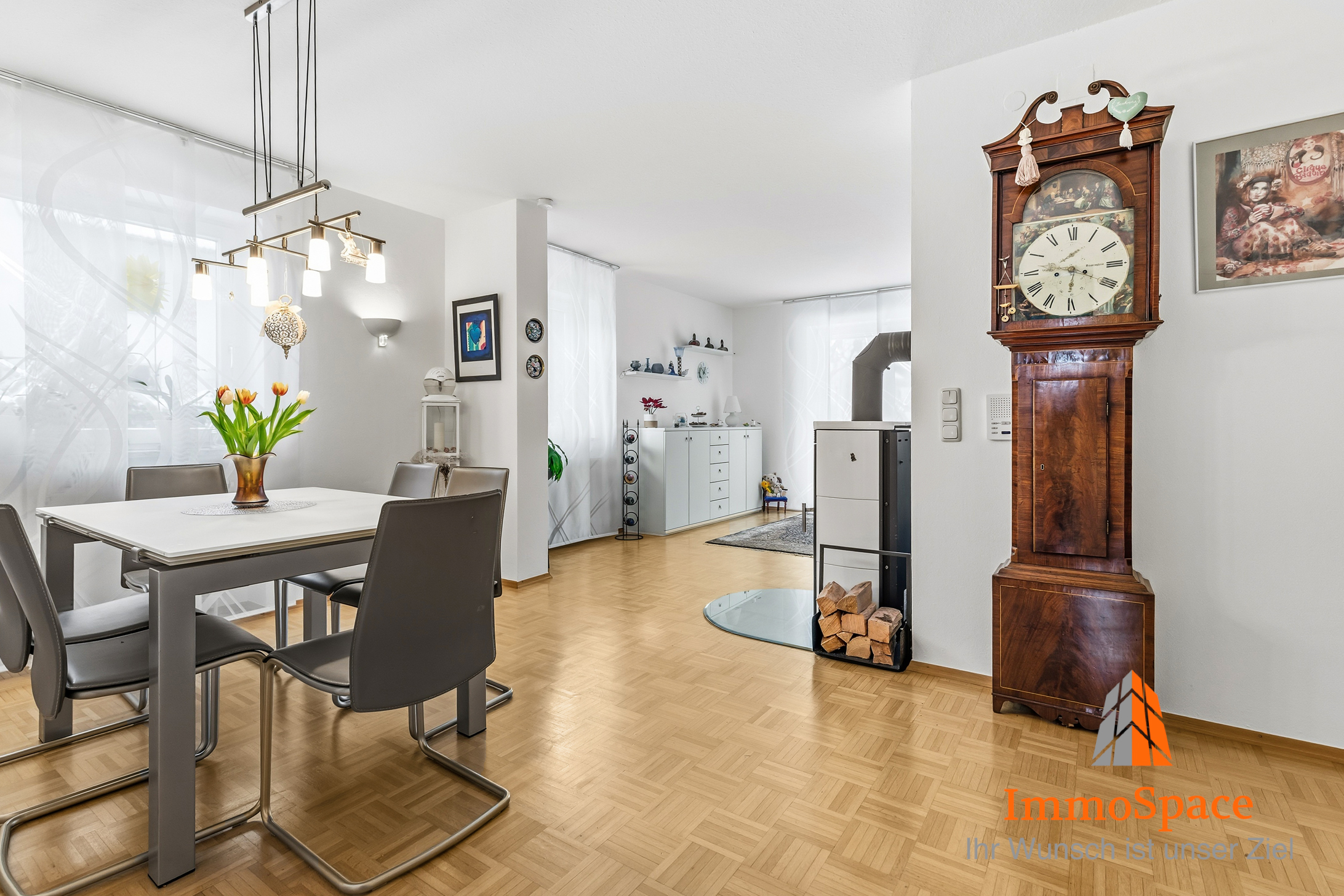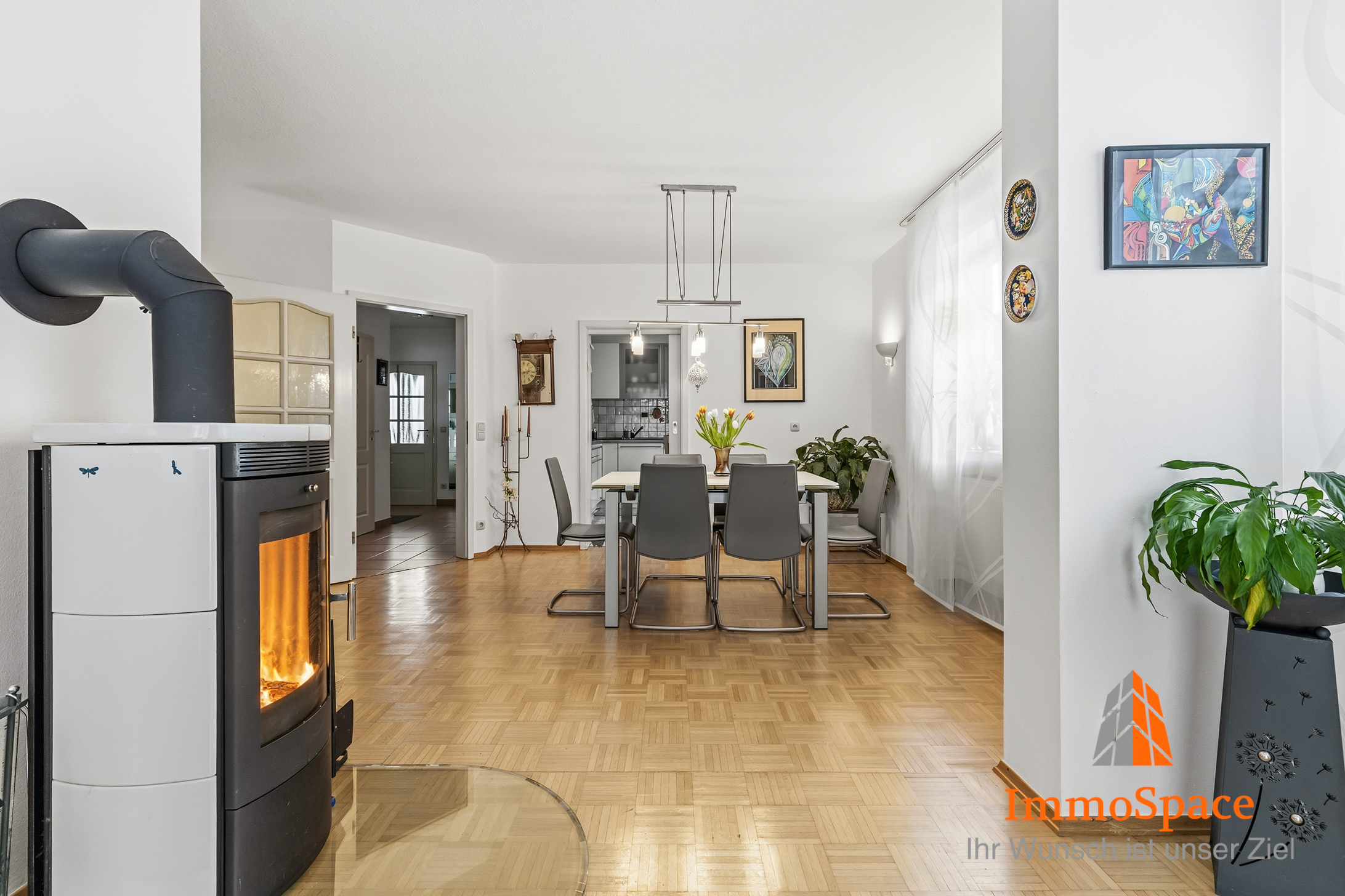 Das angrenzende Esszimmer mit heimeligen Schwedenofen, bietet ausreichend Platz für einen großen Esstisch und lädt zu gemeinsamen Familienessen oder geselligen Abenden mit Freunden ein.