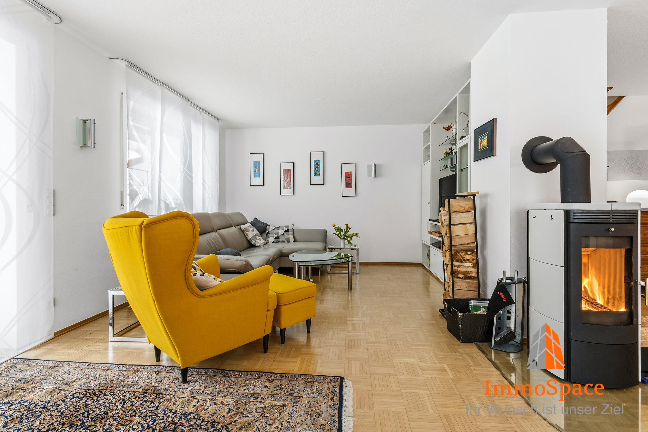 Das Wohnzimmer besticht durch seine Helligkeit und Großzügigkeit. Große Fenster lassen viel Tageslicht herein und bieten einen direkten Zugang zur Terrasse und zum Garten – ideal für sonnige Stunden im Freien, gemütliche Grillabende oder einfach zum Entspannen.